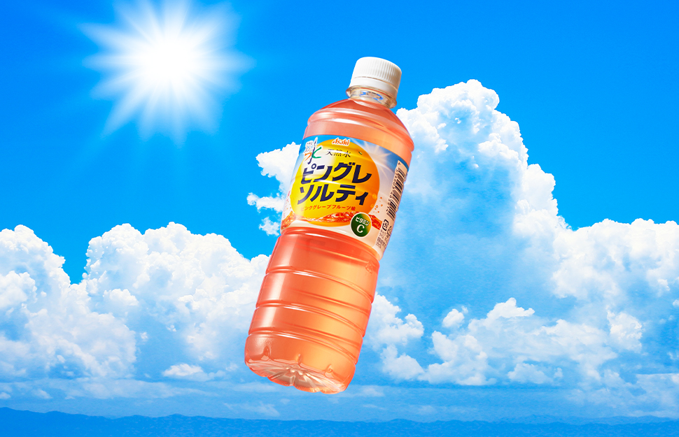パッケージデザインでは、ピンクフレープフルーツのおいしさと天然水のみずみずしさを印象的にデザインしました。 暑い時期や疲れた気分をリフレッシュしたいときに、天然水とピングレの甘酸っぱさが、からだにやさしくにしみわたります。 水分と塩分が同時に補給できる、アサヒ おいしい水の熱中症対策飲料です。
